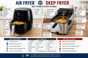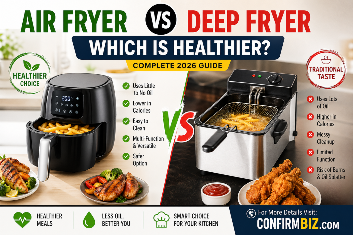 Air Fryer vs Deep Fryer: Which Is Healthier? (Ultimate 2026 Guide) Introduction Fried food is one of the most loved types of meals around the world. From crispy chicken to golden fries, the texture and flavor are hard to resist. However, with growing awareness about health and nutrition, many people are rethinking how they prepare these foods at home. This is where two popular kitchen appliances come into play: the air fryer and the deep fryer. While both can produce crispy and satisfying meals, they operate in completely different ways and have very different effects on your health. If you’re trying to decide between these two, the biggest question is simple: which one is healthier? In this detailed guide, we will break down everything you need to know—from how they work, to their nutritional impact, costs, pros and cons, and which one is right for you. Full Comparison Table Feature Air Fryer Deep Fryer Cooking Method Hot air circulation Oil immersion Oil Usage Very low (1–2 tbsp) Very high (liters) Calories Lower Higher Fat Content Up to 70–80% less High fat content Taste Crispy, lighter Rich, traditional Cooking Speed Fast Moderate Ease of Cleaning Easy Messy Safety Safer Risk of burns/fire Versatility Multi-functional Limited Health Impact Healthier Less healthy Tools Overview What Is an Air Fryer? An air fryer is a modern kitchen appliance that uses rapid hot air circulation to cook food. It works similarly to a convection oven but is more compact and efficient. The appliance circulates hot air around the food at high speed, creating a crispy outer layer without the need for large amounts of oil. This cooking method significantly reduces fat intake while still delivering a fried-like texture. Many air fryers also come with additional features such as baking, roasting, grilling, and reheating, making them highly versatile. What Is a Deep Fryer? A deep fryer is a traditional cooking appliance that fully submerges food in hot oil. This method cooks food quickly and evenly, producing a rich flavor and crispy texture that many people associate with classic fried foods. While deep frying delivers superior taste for many dishes, it also adds a significant amount of calories and fat due to the oil absorption during cooking.