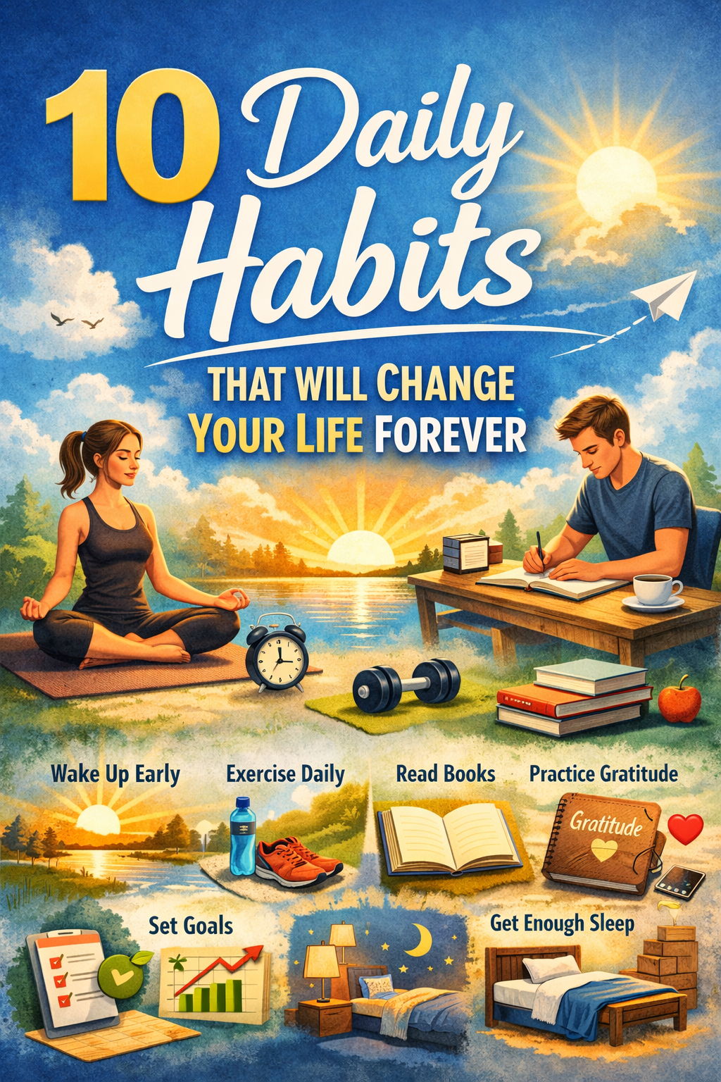 Life Style 10 Daily Habits That Will Change Your Life Forever (Ultimate Guide) by mario March 22, 2026 written by mario March 22, 2026 Bookmark 11 10 Daily Habits That Will Change Your Life Forever Your life is a reflection of your daily habits. What you do every single day—whether consciously or unconsciously—determines your success, happiness, and overall well-being. Many people wait for motivation or a big breakthrough before changing their lives. But the truth is simple: lasting change doesn’t come from one big action—it comes from small habits repeated consistently over time. In this ultimate guide, you’ll discover 10 powerful daily habits that can completely transform your life if you commit to practicing them consistently. Why Daily Habits Matter Habits are the building blocks of your life. Every successful person you admire didn’t get there by chance—they built systems and routines that supported their goals. When you develop positive daily habits: You reduce decision fatigue You become more disciplined You increase productivity You build long-term success effortlessly The key is consistency. Small actions, when repeated daily, compound into massive results over time. 1. Wake Up Early and Take Control of Your Morning Waking up early is one of the most powerful habits you can build. It gives you uninterrupted time to focus on yourself before the world demands your attention. Early mornings allow you to: Plan your day effectively Work on personal goals Start your day with clarity and intention You don’t need to wake up at 4 AM—just 30–60 minutes earlier than usual can make a big difference. We’ve broken this down step-by-step in this article [10 Morning Habits of Highly Successful People in Their 20s] Click here to read more. 2. Practice Gratitude Daily Gratitude is a simple yet powerful habit that shifts your mindset from scarcity to abundance. When you focus on what you’re grateful for, you: Reduce stress and anxiety Improve your mood Develop a positive outlook on life Try writing down 3 things you’re grateful for every morning or night. 3. Exercise and Move Your Body Physical activity is essential for both your body and mind. It boosts energy levels, improves mental clarity, and enhances your overall health. You don’t need an intense workout routine. Simple activities like: Walking Stretching Home workouts can significantly improve your well-being if done consistently. 4. Read and Learn Every Day Reading is one of the fastest ways to grow your knowledge and improve your thinking. Successful individuals dedicate time daily to learning—whether through books, articles, or podcasts. Even 10–20 minutes of reading daily can: Expand your mindset Improve decision-making Increase creativity 5. Set Clear Daily Goals Without direction, it’s easy to waste time. Setting clear goals each day keeps you focused and productive. Start your day by identifying: Your top 3 priorities The most important task (MIT) What success looks like for the day This simple habit can dramatically improve your efficiency. 6. Limit Social Media and Distractions Social media can consume hours of your time without you realizing it. While it has benefits, excessive use can reduce productivity and increase stress. To stay focused: Set time limits for usage Turn off unnecessary notifications Use apps that block distractions Protecting your time is essential for success. To fully understand this concept, check out our detailed post on [Digital Detox for Mental Clarity: The Ultimate Guide to Reclaim Focus, Reduce Stress, and Boost Productivity] Click here to read more. 7. Stay Hydrated and Eat Healthy Your body needs proper fuel to function at its best. Drinking enough water and eating nutritious foods can significantly impact your energy levels and focus. Healthy habits include: Drinking 6–8 glasses of water daily Eating balanced meals Reducing processed foods 8. Practice Mindfulness or Meditation Taking time to calm your mind can improve focus, reduce stress, and enhance emotional control. You can practice mindfulness by: Meditating for 5–10 minutes Practicing deep breathing Being present in the moment 9. Reflect on Your Day Reflection helps you learn from your experiences and improve continuously. At the end of each day, ask yourself: What went well today? What could I improve? What did I learn? 10. Prioritize Quality Sleep Sleep is often overlooked, but it is essential for productivity and health. Lack of sleep can lead to: Reduced focus Low energy Poor decision-making Aim for 7–8 hours of quality sleep each night to perform at your best. How to Build These Habits Successfully Knowing these habits is not enough—you must implement them consistently. Here are proven strategies: Start small: Focus on one habit at a time Be consistent: Show up daily, even when it’s hard Track progress: Use a habit tracker Stay patient: Results take time You may also find this helpful [Modern Lifestyle Improvement: 15 Powerful Ways to Transform Your Life] Click here to read more. Final Thoughts Your life doesn’t change overnight—it changes daily. The small habits you practice today will shape your future. Start with one or two habits from this list and build gradually. With consistency and discipline, you can completely transform your life. FAQs How long does it take to form a habit? It typically takes between 21 and 66 days, depending on the habit and your consistency. What is the most powerful daily habit? Consistency is the most powerful habit. Small actions repeated daily create long-term success. Can small habits really change your life? Yes. Small habits compound over time and lead to significant life changes. For more tips on Daily habits that change your life, check our lifestyle category Lifestyle category. Have any thoughts? Share your reaction or leave a quick response — we’d love to hear what you think! 0 0 0 0 0 0 daily habitsPersonal Growthproductivity habitsself improvement