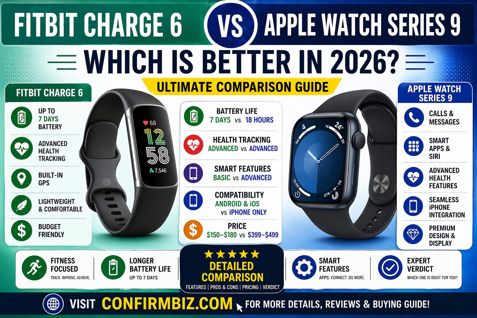 Fitness Products Fitbit Charge 6 vs Apple Watch Series 9: Which Is Better in 2026? (Ultimate Guide) by mario April 24, 2026 written by mario April 24, 2026 Bookmark 15 Fitbit Charge 6 vs Apple Watch Series 9: Which Is Better in 2026? Introduction Wearable technology has become an essential part of modern life, helping millions of people track their health, improve fitness, and stay connected. Among the top contenders in this space are the Fitbit Charge 6 and the Apple Watch Series 9. While both devices offer powerful features, they are built for different audiences. One is a dedicated fitness tracker focused on long-term health insights, while the other is a premium smartwatch designed to integrate seamlessly into your digital lifestyle. If you’re trying to decide which one is better, this comprehensive guide will walk you through every detail — from design and battery life to real-world performance and value for money. By the end, you’ll know exactly which device suits your needs. Full Detail Comparison Table Feature Fitbit Charge 6 Apple Watch Series 9 Device Type Fitness Tracker Smartwatch Display AMOLED Touchscreen Always-On Retina OLED Battery Life Up to 7 days Up to 18 hours Health Sensors Heart Rate, ECG, SpO2, Stress Heart Rate, ECG, Blood Oxygen, Temperature GPS Built-in GPS Advanced GPS + precision tracking Smart Features Basic notifications Apps, calls, messaging, Siri Compatibility Android & iOS iPhone only Water Resistance 50 meters 50 meters Price $150 – $180 $399 – $499 Tools Overview Fitbit Charge 6 Overview The Fitbit Charge 6 is built with one goal in mind: helping users improve their health and fitness. It focuses heavily on tracking physical activity, heart rate, sleep quality, and stress levels. Unlike traditional smartwatches, it avoids unnecessary distractions. This makes it ideal for people who want accurate insights without constant notifications. It also integrates with Google services, offering features like Google Maps and YouTube Music controls, which enhance usability without turning it into a full smartwatch. Apple Watch Series 9 Overview The Apple Watch Series 9 is a premium smartwatch powered by Apple’s advanced chip technology. It goes far beyond fitness tracking by offering a full ecosystem of apps, communication tools, and smart features. With capabilities like voice control, messaging, calling, and deep iPhone integration, it acts as an extension of your smartphone. It’s designed for users who want both health tracking and digital convenience in one device. Head-to-Head Comparison 1. Design and Build Quality The Apple Watch Series 9 features a sleek, premium design with a large rectangular display that is bright, responsive, and easy to interact with. It feels like a high-end device and offers multiple case finishes and band options. In contrast, the Fitbit Charge 6 has a slim, minimalist design. It’s lighter and less bulky, making it more comfortable for continuous wear, especially during sleep or intense workouts. If style and screen size matter, Apple wins. If comfort and simplicity are your priority, Fitbit stands out. 2. Battery Life Battery life is one of the biggest differences between these devices. The Fitbit Charge 6 can last up to 7 days on a single charge, depending on usage. The Apple Watch Series 9, however, typically requires daily charging, with an average battery life of around 18 hours. For users who prefer convenience and fewer charging cycles, Fitbit clearly has the advantage. 3. Health and Fitness Tracking Both devices offer advanced health tracking features, but they approach it differently. Fitbit excels in long-term health monitoring, providing detailed insights into sleep, stress, and recovery. Its app is designed to help users understand trends over time. Apple, on the other hand, focuses on a broader health ecosystem, including ECG readings, temperature tracking, and integration with health apps. If your primary goal is fitness improvement and habit tracking, Fitbit may be the better option. If you want a wider range of health tools, Apple has the edge. 4. Smart Features and Connectivity This is where the Apple Watch Series 9 dominates. It allows you to: Make and receive calls Send messages Install apps Use voice commands Control smart home devices The Fitbit Charge 6 offers only basic notifications and limited app interactions. If you want a smartwatch experience, Apple is the clear winner. 5. Performance and Speed The Apple Watch Series 9 is powered by a more advanced processor, making it faster and smoother when navigating apps and performing tasks. Fitbit Charge 6 is optimized for efficiency rather than speed. It performs well for tracking but lacks the responsiveness of a full smartwatch. Key Features Fitbit Charge 6 Key Features Accurate heart rate tracking Sleep and stress monitoring 7-day battery life Lightweight and comfortable design Google app integration Affordable pricing Apple Watch Series 9 Key Features Advanced S9 chip for fast performance Always-on display Double Tap gesture control Full app ecosystem Seamless iPhone integration Advanced health tracking features Pros and Cons Fitbit Charge 6 Pros: Excellent battery life Budget-friendly Great for fitness tracking Comfortable for all-day wear Cons: Limited smart features Smaller display Fewer customization options Apple Watch Series 9 Pros: Premium design and display Full smartwatch functionality Powerful performance Wide app support Cons: Expensive Short battery life iPhone-only compatibility Pricing and Value for Money Pricing plays a major role when choosing between these two devices. The Fitbit Charge 6 is significantly more affordable, typically priced between $150 and $180. This makes it an excellent option for budget-conscious users who still want high-quality fitness tracking. The Apple Watch Series 9, on the other hand, starts at around $399 and can go up to $499 or more, depending on the configuration. While Apple offers more features