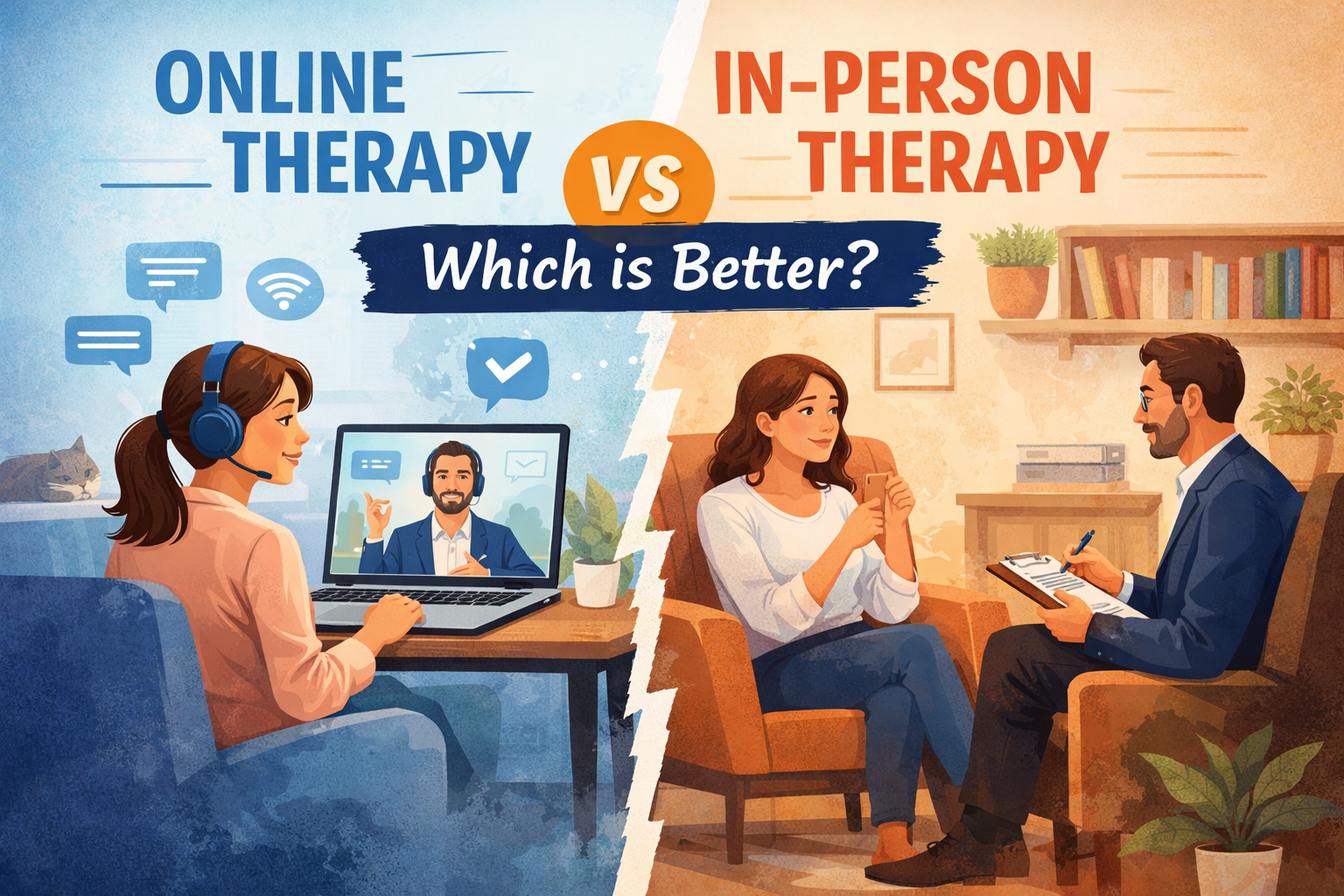 My Therapy Online Therapy vs In-Person Therapy: Which Is Better? (2026 Ultimate Guide) by mario March 4, 2026 written by mario March 4, 2026 Bookmark 18 Online Therapy vs In-Person Therapy: Which Is Better in 2026? (Complete Authority Guide) Mental health care has changed dramatically over the past decade. What once required sitting inside a therapist’s office is now available at the tap of a screen. As more people prioritize emotional well-being, one major question continues to dominate conversations: Online therapy vs in-person therapy — which is better? The short answer? It depends on your needs, lifestyle, mental health condition, and personal preference. The long answer? That’s exactly what this in-depth, research-backed guide will help you understand. In this comprehensive comparison, we’ll examine effectiveness, cost, privacy, therapeutic connection, accessibility, safety, and long-term outcomes — so you can confidently decide which format works best for you. Understanding the Modern Therapy Landscape Therapy is no longer limited to a physical office. Thanks to advancements in telehealth technology, mental health professionals can now deliver high-quality care remotely. Both online therapy (also known as teletherapy) and in-person therapy are provided by licensed professionals such as: Clinical psychologists Licensed professional counselors (LPCs) Licensed clinical social workers (LCSWs) Marriage and family therapists (MFTs) Psychiatrists The core therapeutic techniques — such as Cognitive Behavioral Therapy (CBT), psychodynamic therapy, and trauma-focused therapy — remain the same regardless of format. What changes is the delivery method. What Is Online Therapy? Online therapy allows you to connect with a licensed therapist through digital platforms using: Video sessions Phone calls Live chat Secure messaging Sessions are conducted via HIPAA-compliant platforms that protect confidentiality and client privacy. Why Online Therapy Has Grown So Rapidly Increased mental health awareness Technological advancement Demand for flexible healthcare Reduced stigma Global events that normalized remote care For many individuals, online therapy removed barriers that once prevented them from seeking help. What Is In-Person Therapy? In-person therapy is the traditional model where you meet face-to-face with your therapist in a private office setting. Sessions typically last 45–60 minutes and occur weekly. The environment is structured, confidential, and professionally designed to encourage open communication. This format has decades of clinical validation and remains highly effective for a wide range of mental health conditions. Online Therapy vs In-Person Therapy: Effectiveness Comparison Is Online Therapy as Effective? Multiple clinical studies show that online therapy can be equally effective as in-person therapy for many common conditions, including: Generalized anxiety disorder Social anxiety Depression Stress-related disorders Relationship challenges Cognitive Behavioral Therapy (CBT), in particular, translates very well to online formats because it focuses on structured exercises and cognitive reframing techniques. When In-Person Therapy May Be More Effective In-person therapy may be better suited for: Severe mental illness Active suicidal ideation Complex trauma (PTSD) Psychosis or dissociative disorders Cases requiring close monitoring Therapists can better assess physical cues, agitation, and non-verbal signals in a face-to-face setting. Authority Insight: Research consistently shows that therapeutic alliance — the bond between therapist and client — is more important than the format itself. Cost Breakdown: Which Is More Affordable? Online Therapy Costs Often subscription-based Lower overhead expenses No travel costs Flexible pricing models Average cost per session can be lower compared to traditional therapy, depending on region. In-Person Therapy Costs Higher office overhead Transportation expenses Parking fees Potential time off work Insurance coverage varies. Some plans cover both formats equally, while others may favor telehealth services. Verdict: Online therapy tends to be more budget-friendly for most individuals. Convenience & Accessibility One of the biggest advantages of online therapy is accessibility. Online Therapy Accessibility Benefits Available in rural or underserved areas Accessible for individuals with disabilities Ideal for busy professionals Eliminates commute time Easier scheduling flexibility For bloggers, entrepreneurs, remote workers, and students with tight schedules, this flexibility can significantly increase therapy consistency. In-Person Therapy Accessibility Challenges Limited provider availability in some regions Travel time Traffic or transportation barriers Weather disruptions Privacy & Confidentiality Considerations Online Therapy Privacy Online platforms use encrypted technology to protect data. However, privacy at home depends on your environment. If you live with family, roommates, or children, finding a quiet, confidential space may be challenging. In-Person Therapy Privacy A therapist’s office provides a neutral, controlled environment specifically designed for confidentiality. Some individuals feel safer discussing sensitive topics outside their home setting. Key Insight: Privacy concerns are highly situational and depend on your living arrangement. Therapeutic Connection & Emotional Depth Many people wonder whether therapy can feel “real” through a screen. Advantages of In-Person Emotional Presence Full body language observation Physical presence enhances bonding Less screen fatigue Fewer technological interruptions Online Therapy Connection Strengths Clients often feel safer opening up at home Reduced social anxiety Increased comfort and familiarity Interestingly, some individuals report deeper vulnerability online because they feel less intimidated. Technology & Reliability Online therapy requires: Stable internet co