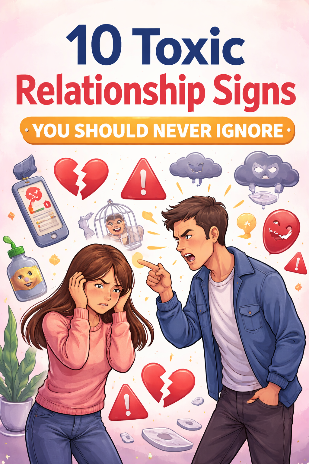 Relationship 10 Toxic Relationship Signs You Should Never Ignore (Ultimate Guide) by mario March 24, 2026 written by mario March 24, 2026 Bookmark 10 10 Toxic Relationship Signs You Should Never Ignore (Complete Guide) Relationships are supposed to be a source of love, comfort, and support. When you’re in a healthy relationship, you feel valued, respected, and emotionally safe. However, not every relationship meets these standards. Some relationships slowly become harmful, draining your energy, confidence, and happiness. Recognizing toxic relationship signs early can save you from emotional damage and help you regain control of your life. Unfortunately, many people ignore red flags because of love, attachment, or fear of being alone. In this in-depth guide, you’ll learn how to identify toxic behaviors, understand their impact, and take practical steps toward a healthier and happier life. Table of Contents What is a Toxic Relationship? Why People Stay in Toxic Relationships 10 Toxic Relationship Signs You Should Never Ignore Hidden Signs of Emotional Abuse Effects of Toxic Relationships on Mental Health How to Deal with a Toxic Relationship How to Build Healthy Relationships Conclusion What is a Toxic Relationship? A toxic relationship is one where negative behaviors consistently outweigh positive ones. Instead of feeling supported and happy, you often feel anxious, drained, or insecure. Toxicity can exist in romantic relationships, friendships, or even family dynamics. It often involves manipulation, disrespect, control, and emotional harm. Unlike normal relationship challenges, toxic patterns are repeated and rarely resolved. Over time, they can damage your self-esteem and mental health. Why People Stay in Toxic Relationships Understanding why people stay in unhealthy relationships is crucial. It’s not always as simple as “just leave.” 1. Emotional Attachment Love can make it difficult to see reality clearly. People often hold onto the good moments and ignore the bad ones. 2. Fear of Being Alone Many individuals prefer staying in a toxic relationship rather than facing loneliness or starting over. 3. Low Self-Esteem Toxic partners can damage your confidence, making you feel like you don’t deserve better. 4. Hope for Change People often believe their partner will change, especially after apologies or temporary improvements. 5. Financial or Social Dependence In some cases, leaving may feel impossible due to financial reliance or societal pressure. 10 Toxic Relationship Signs You Should Never Ignore 1. Constant Criticism and Negativity If your partner frequently criticizes you, belittles your achievements, or makes you feel inadequate, it’s a clear red flag. Healthy relationships involve encouragement, not constant judgment. 2. Lack of Trust Trust is the foundation of any relationship. If there are constant accusations, jealousy, or spying behaviors, it creates a stressful and unhealthy environment. 3. Controlling Behavior A toxic partner may try to control your decisions, friendships, appearance, or daily activities. This behavior often starts subtly and becomes more intense over time. 4. Poor Communication Instead of resolving issues through discussion, toxic relationships involve silent treatment, shouting, or avoidance. Problems remain unresolved, leading to frustration. 5. Emotional Manipulation Manipulation tactics include guilt-tripping, gaslighting, and shifting blame. Over time, you may begin to question your own reality. 6. Lack of Support A healthy partner supports your dreams and goals. If your partner dismisses your ambitions or undermines your success, it’s a sign of toxicity. 7. Walking on Eggshells If you constantly feel like you have to be careful not to upset your partner, it indicates an unhealthy emotional environment. 8. Frequent and Unresolved Arguments Disagreements are normal, but constant fighting without resolution signals deeper issues. 9. Disrespect Disrespect can appear as insults, sarcasm, ignoring your opinions, or public embarrassment. Respect is non-negotiable in any relationship. 10. Emotional or Physical Abuse Any form of abuse—verbal, emotional, or physical—is a serious and dangerous sign. This should never be tolerated under any circumstances. Hidden Signs of Emotional Abuse Not all toxic behaviors are obvious. Some are subtle and harder to detect. Gaslighting (making you doubt your reality) Love bombing followed by withdrawal Passive-aggressive behavior Isolation from friends and family Blaming you for everything These behaviors can slowly erode your confidence and sense of self. Effects of Toxic Relationships on Mental Health Being in a toxic relationship can have serious long-term consequences on your mental and emotional well-being. 1. Anxiety and Stress Constant tension and conflict can lead to chronic anxiety and emotional exhaustion. 2. Depression Feeling trapped or unvalued can result in sadness, hopelessness, and loss of motivation. 3. Low Self-Esteem Continuous criticism and manipulation can make you feel unworthy or incapable. 4. Loss of Identity You may begin to lose sight of who you are as you prioritize the relationship over yourself. 5. Social Isolation Toxic partners often isolate you from friends and family, reducing your support system. How to Deal with a Toxic Relationship 1. Acknowledge the Problem The first step is recognizing that the relationship is unhealthy. Denial only prolongs the pain. 2. Set Boundaries Clearly define what behavior you will and will not tolerate. Boundaries are essential for self-respect. 3. Communicate Your Concerns Have an honest conversation about how you feel. In some cases, awareness can lead to change. 4. Seek Support Talk to trusted friends, family members, or a therapist. External perspectives can provide clarity. 5. Prioritize Your Mental Health Engage in self-care activities, journaling, exercise, or mindfulness practices. 6. Be Prepared to Walk Away If the relationship does not 