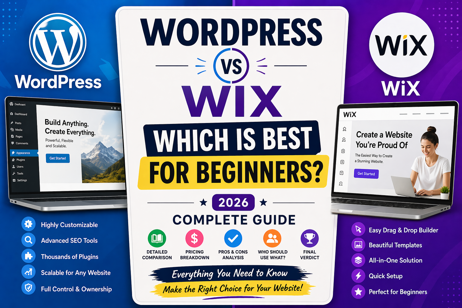 WordPress vs Wix: Which is Best for Beginners in 2026? (Complete Guide) Introduction Starting a website today is easier than ever, but choosing the right platform can still feel overwhelming—especially for beginners. Whether you’re launching a blog, business website, portfolio, or online store, the platform you choose will affect your design, performance, SEO, and long-term growth. Two of the most popular website-building platforms are WordPress and Wix. Both are powerful, widely used, and beginner-friendly in different ways. However, they take very different approaches when it comes to website creation. WordPress offers complete flexibility and control, while Wix focuses on simplicity and ease of use. So, which one should you choose? In this detailed 2026 guide, we break down everything you need to know about WordPress vs Wix—including features, pricing, SEO, ease of use, and long-term scalability—to help you make the best decision. Tools Overview What is WordPress? WordPress is an open-source content management system (CMS) that powers over 40% of all websites on the internet. It allows users to create and manage websites with complete freedom and flexibility. There are two versions of WordPress: WordPress.org – Self-hosted version (recommended) WordPress.com – Hosted version with limitations With WordPress.org, you need to purchase hosting and a domain name, but in return, you get full control over your website. What is Wix? Wix is a cloud-based website builder designed for beginners. It offers an all-in-one solution that includes hosting, templates, security, and design tools. Its standout feature is the drag-and-drop editor, which allows users to build websites visually without coding. Wix is ideal for users who want to create a website quickly without dealing with technical setup. Full Comparison Table Feature WordPress Wix Ease of Use Moderate (learning curve) Very easy (drag-and-drop) Customization Unlimited flexibility Limited customization Hosting Required separately Included Design Options 10,000+ themes 800+ templates SEO Capabilities Advanced and powerful Good but limited Pricing Flexible Subscription-based Scalability Excellent Moderate Maintenance User-managed Automatic eCommerce WooCommerce integration Built-in store features Head-to-Head Comparison 1. Ease of Use Wix clearly wins when it comes to ease of use. Its drag-and-drop builder allows you to design your site visually without touching code. You can move elements anywhere on the page, making it perfect for beginners. WordPress, on the other hand, has a steeper learning curve. While modern page builders have made it easier, beginners still need to understand hosting, themes, and plugins. Verdict: Wix is better for absolute beginners. 2. Flexibility and Customization WordPress is unmatched in flexibility. You can customize every aspect of your website using themes, plugins, and custom code. Wix provides customization, but within limits. You cannot fully modify backend functionality like you can with WordPress. Verdict: WordPress wins for flexibility. 3. Performance and Speed Wix handles performance optimization automatically. This makes it reliable without requiring technical knowledge. WordPress performance depends on your hosting provider and optimization. With the right setup, WordPress can be faster than Wix. Verdict: Tie (depends on setup). 4. SEO Capabilities WordPress is widely considered the best platform for SEO. With plugins like Yoast SEO or Rank Math, you can optimize every aspect of your site. Wix has improved its SEO features significantly, offering tools like SEO guides and meta tag customization. However, it still lacks the depth of WordPress. Verdict: WordPress wins. 5. Security Wix handles all security for you, including updates and protection. WordPress requires you to manage security manually through plugins and updates. Verdict: Wix is easier and safer for beginners. Key Features WordPress Key Features Open-source platform Full control over website files Massive plugin ecosystem Advanced blogging tools Highly scalable eCommerce with WooCommerce Custom code support Wix Key Features Drag-and-drop builder All-in-one hosting solution AI website builder (Wix ADI) Pre-designed templates Built-in SEO tools App marketplace Automatic updates Pros and Cons WordPress Pros Unlimited customization Best SEO capabilities Scalable for any project Large community and support Full ownership of your site WordPress Cons Learning curve for beginners Requires hosting setup Manual maintenance needed Can become complex Wix Pros Extremely easy to use No technical setup required Fast website creation All-in-one platform Great for small projects Wix Cons Limited customization Less powerful SEO tools Harder to scale Template lock (cannot switch easily) Pricing WordPress Pricing Breakdown WordPress itself is free, but costs include: Hosting: $3 – $15/month Domain name: $10 – $15/year Premium themes: $30 – $100 (optional) Plugins: Free to premium ($0 – $200/year) Total estimated cost: $50 – $200/year (basic site) Wix Pricing Plans Free Plan (with ads) Combo Plan: ~$10/month Unlimited Plan: ~$15/month Business Plans: $20 – $30/month Total estimated cost: $120 – $360/year Key Insight: WordPress can be cheaper but requires setup. Wix is more predictable but costs more over time. Who Should Use It? Choose WordPress if: You want full control over your website You plan to grow or monetize your site You care about advanced SEO You are willing to learn technical basics You want long-term scalability Choose Wix if: You are a complete beginner You want a quick website setup You don’t want to manage hosting or security You need a simple website You prefer a visual editor Final Verdict Both WordPress and Wix are excellent platforms—but they serve different types of users. If you want simplicity, speed, and ease of use, Wix is the better choice for beginners. However, if you are serious about building a long-t