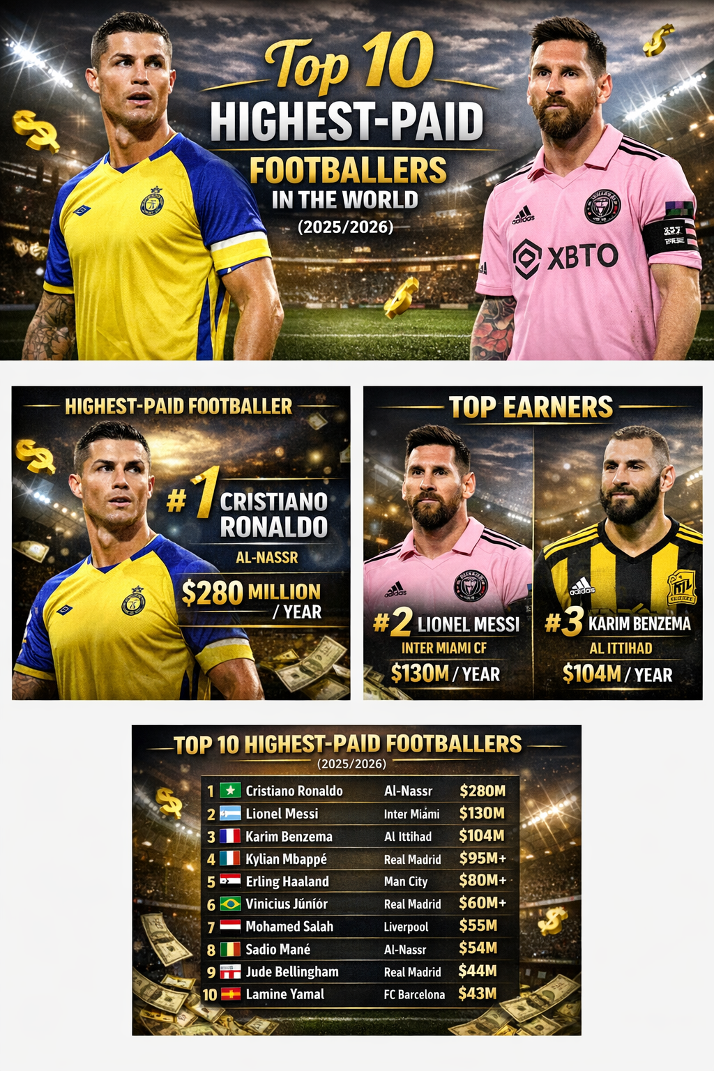 Bookmark Football Updates Top 10 Highest-Paid Footballers in the World Right Now by mario February 2, 2026 written by mario Top 10 Highest-Paid Footballers in the World Right Now (2025/2026) Football is not only the world’s most popular sport — it’s also a massive financial powerhouse. The game’s top stars command extraordinary salaries, bonuses and endorsement deals that place them among the highest-earning athletes on the planet. Here’s a look at the top 10 highest-paid footballers in the world right now, based on estimated combined income from club contracts, bonuses and off-field earnings like sponsorships and endorsements. 📊 Top 10 Highest-Paid Footballers (Estimated Annual Earnings) Rank Player Club Estimated Earnings (USD) 1 Cristiano Ronaldo Al-Nassr $280M 2 Lionel Messi Inter Miami CF $130M 3 Karim Benzema Al Ittihad $104M 4 Kylian Mbappé Real Madrid $95M+ 5 Erling Haaland Manchester City $80M+ 6 Vinícius Júnior Real Madrid $60M+ 7 Mohamed Salah Liverpool FC $55M+ 8 Sadio Mané Al-Nassr $54M+ 9 Jude Bellingham Real Madrid $44M 10 Lamine Yamal FC Barcelona $43M 🔥 Highlights From the List Cristiano Ronaldo continues to dominate as football’s top earner, with an eye-watering estimated income of around $280 million — boosted by a lucrative Saudi Pro League contract and major endorsement deals. Lionel Messi follows in second, thanks to his contract at Inter Miami and a portfolio of global sponsorships that keep his earnings sky-high. Karim Benzema, even in the latter stage of his career at Al Ittihad, ranks third — a testament to the financial pull of Middle Eastern clubs. Youngstars like Jude Bellingham and Lamine Yamal have also cracked the top 10, showing that elite performance on the pitch translates directly into astronomical earnings off it. 📌 Final Thoughts The world of football earnings is constantly evolving. Player salaries, endorsement deals, and commercial ventures can shift year to year — but one thing remains clear: the biggest names in the sport are also some of the most financially successful athletes on earth. February 2, 2026 0 comments FacebookTwitterPinterestEmail