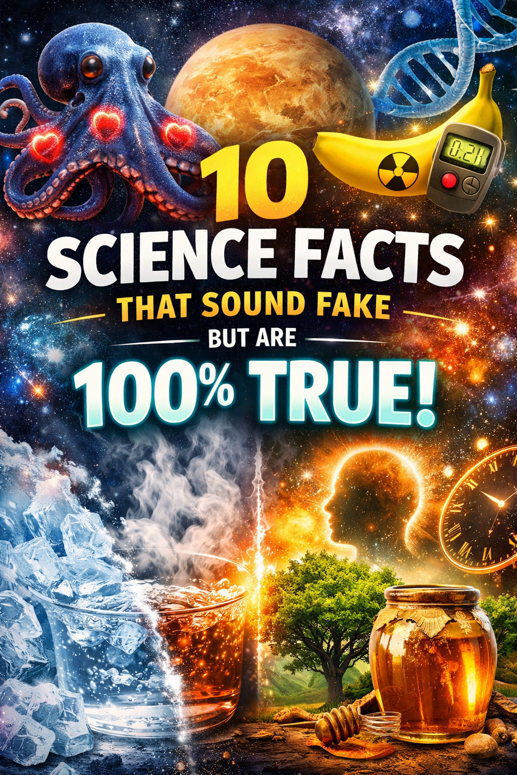 10 Science Facts That Sound Fake but Are 100% True Did you know that bananas are radioactive, or that water can boil and freeze at the same time? Science is full of mind-bending truths that sound like myths, clickbait, or straight-up lies — but they’re real. In this post, we explore 10 science facts that sound fake but are absolutely true. These facts are verified, fascinating, and guaranteed to make you say, “No way!” Let’s dive in. 1. Bananas Are Naturally Radioactive This one sounds like a joke, but it’s real. Bananas are radioactive. Bananas contain potassium, and a small percentage of that potassium is the radioactive isotope potassium-40. Because of this, bananas emit tiny amounts of radiation. Don’t panic — you’d have to eat millions of bananas at once for it to be dangerous. In fact, scientists even use something called the “banana equivalent dose” to explain radiation exposure in a fun way. Science takeaway: Radioactivity exists naturally all around us, even in everyday foods. 2. Water Can Boil and Freeze at the Same Time Yes, water can boil and freeze simultaneously — under the right conditions. This happens at a specific temperature and pressure called the triple point. At this point, water exists as a solid, liquid, and gas all at once. Scientists can demonstrate this in laboratories using vacuum chambers. Watching ice, liquid water, and water vapor coexist feels like a glitch in reality. Science takeaway: Temperature and pressure matter just as much as heat. 3. Octopuses Have Three Hearts and Blue Blood Octopuses are basically aliens living in our oceans. They have three hearts — two pump blood to the gills, and one pumps blood to the rest of the body. Even stranger, their blood is blue, not red. This is because octopus blood uses hemocyanin, a copper-based molecule, instead of iron-based hemoglobin like humans. Science takeaway: Life evolves differently depending on environment. 4. You Are Never Actually Touching Anything It feels like you’re touching your phone right now — but scientifically, you’re not. Atoms are surrounded by electron clouds that repel each other. When you “touch” something, the electromagnetic forces between atoms push back, creating the sensation of contact. So technically, everything you touch is separated by microscopic gaps. Science takeaway: Solid objects are mostly empty space. 5. There Are More Trees on Earth Than Stars in the Milky Way This sounds completely made up, but studies confirm it. Scientists estimate there are about 3 trillion trees on Earth. Meanwhile, astronomers estimate the Milky Way contains around 100–400 billion stars. That means our planet may be greener than our galaxy is bright. Science takeaway: Earth is far more abundant than we often realize. 6. A Day on Venus Is Longer Than a Year on Venus Venus refuses to make sense. It takes Venus about 243 Earth days to rotate once (one day) but only 225 Earth days to orbit the Sun (one year). So if you lived on Venus, your birthday would come before the Sun rose again. Science takeaway: Planetary motion isn’t always intuitive. 7. Humans Share About 60% of Their DNA with Bananas No, this doesn’t mean humans are part banana. It means that many basic cellular processes are shared across living organisms. DNA similarities reflect shared biological functions, not appearance or intelligence. Still, knowing you share genetic material with fruit is humbling. Science takeaway: Life on Earth is deeply interconnected. 8. Honey Never Spoils Archaeologists have found pots of honey in ancient Egyptian tombs — and it was still edible. Honey lasts forever because it has low moisture, high acidity, and natural antibacterial properties. Bacteria simply can’t survive in it. If honey crystallizes, warming it gently brings it back to liquid form. Science takeaway: Nature sometimes outperforms modern preservatives. 9. Your Body Glows (But You Can’t See It) Humans emit a faint visible light — but our eyes aren’t sensitive enough to detect it. This glow is caused by biochemical reactions inside our bodies that produce tiny amounts of light through a process called bioluminescence. Special cameras can actually capture this glow in dark environments. Science takeaway: You’re literally glowing with life. 10. Time Moves Slower at Your Feet Than Your Head Thanks to Einstein’s theory of relativity, time is not the same everywhere. Gravity affects time, meaning clocks closer to Earth’s surface tick slightly slower than those higher up. The difference is tiny, but measurable with atomic clocks. Your feet are technically aging more slowly than your head. Science takeaway: Time is flexible, not absolute. Final Thoughts Science isn’t boring — it’s just often misunderstood. The universe is filled with truths that sound fake, impossible, or exaggerated, yet they are backed by solid evidence. If this post surprised you, imagine how many more incredible facts are still waiting to be discovered. Which of these facts shocked you the most? Share this post with a friend and see if they believe you — or think you’re making it up.